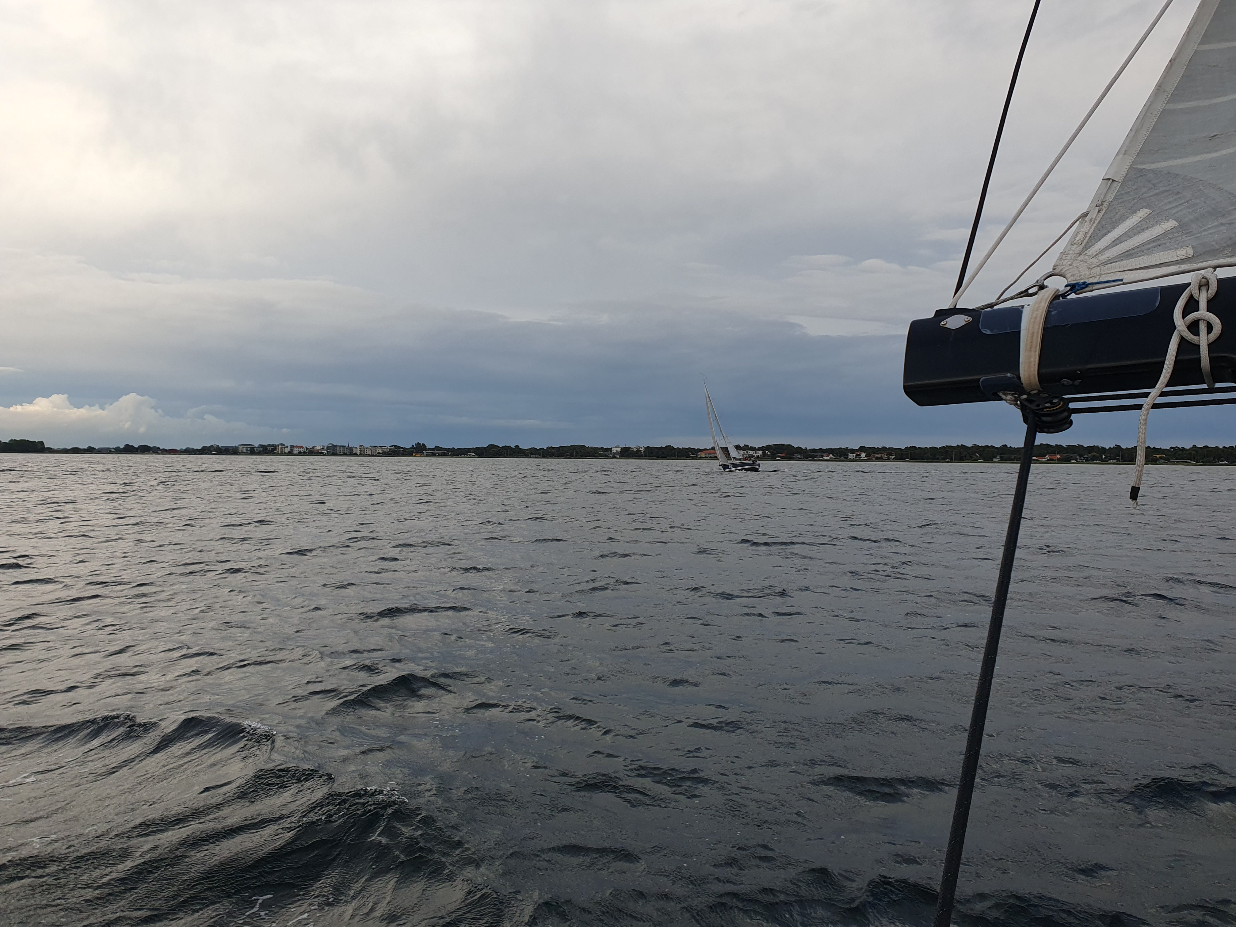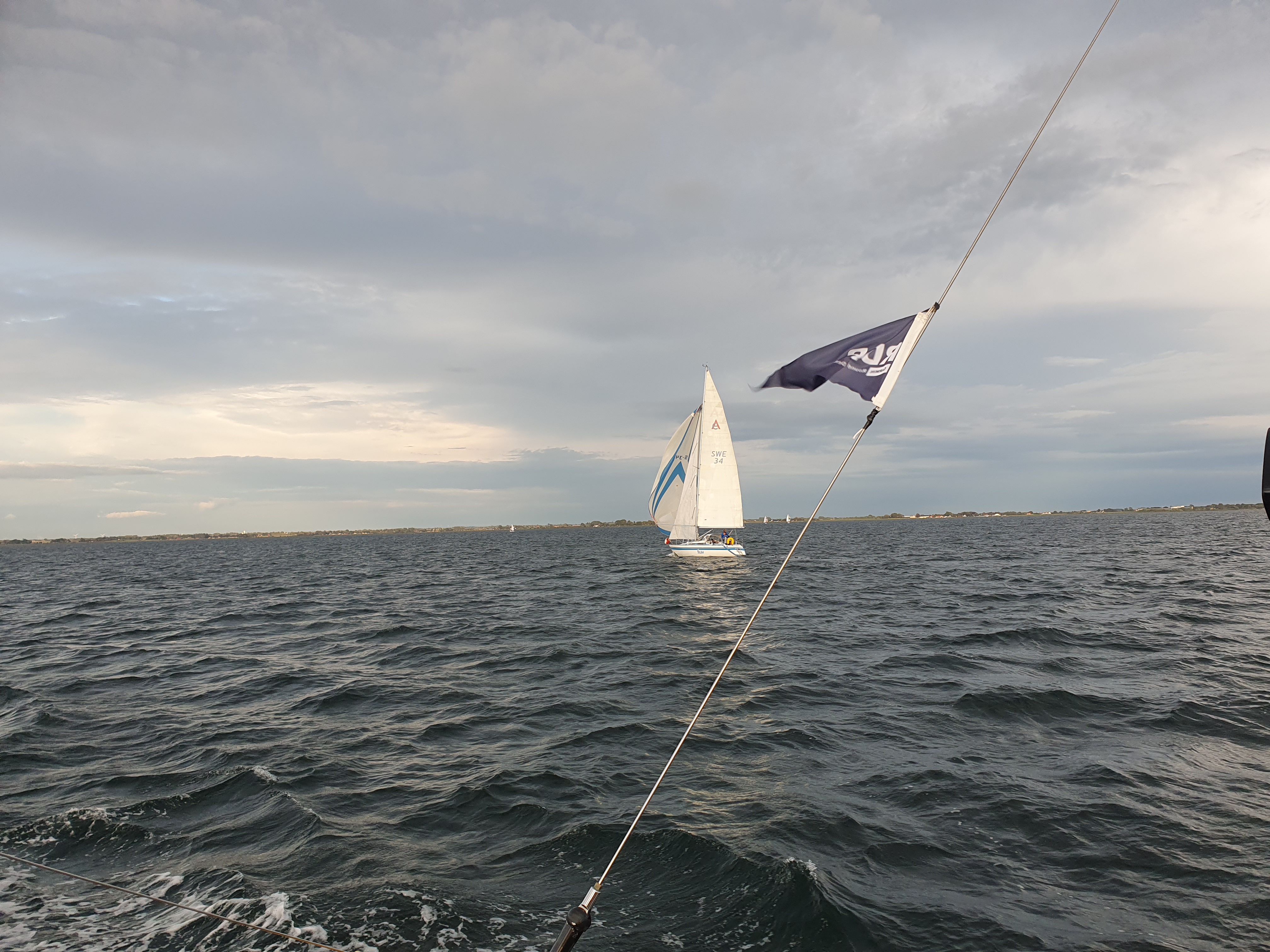 Konstiga väderutsikter som gjorde att vi lade en bana för V-NV vind omkring 6 m/s. Aj så fel det blev, inte riktningen men styrkan. I det väldigt mörka moln som närmade sig fick vi typ 30 minuter med kuling. Flera såg upp till 17 m/s. C-55, Nemo o XAR bröt seglingen. Den sistnämnda beroende på hysteriskt många nät väster om farleden. J-Hawk vann seglingen med Gete på välförtjänt andra plats.